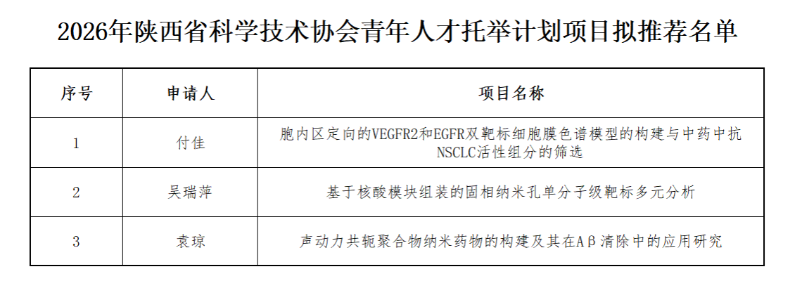 按照陕西省科学技术协会《关于开展2026年陕西省科协技术协会青年人才托举计划项目申报工作的通知》(陕科协发﹝2026﹞事企字2号)的有关要求,我校组织了项目申报评审工作。经个人申请、二级单位推荐、科技处组织专家评审、评审结果通过校学术委员会审议。现将评审结果进行公示,公示内容包括:拟推荐上报项目负责人姓名、项目名称。