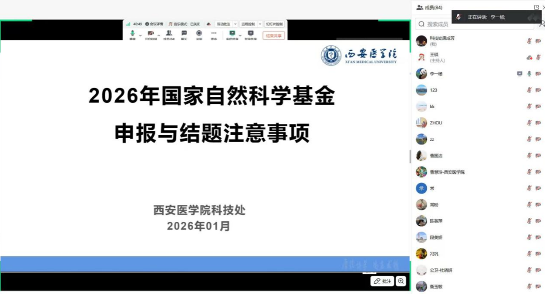 为扎实推进2026年度国家自然科学基金项目申报工作,帮助科研人员准确把握政策动向、提升申请书撰写质量,进一步强化学术诚信意识,营造求真务实的科研氛围,我校于1月30日下午以线上形式成功召开“2026年国家自然科学基金申请政策解读及科研诚信教育专题会议”。本次会议由科技处组织,各学院、研究所、附属医院的科研负责人、科研秘书及拟申报基金的教师、科研人员等近百人线上参会。
